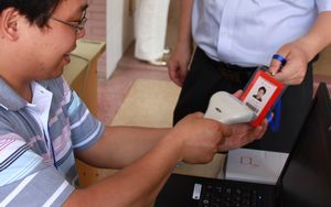 左图考务室里监考人员正在接受监考证件条形码扫描检查。这是每场考试必经的程序,来不得半点马虎。各个考场监考人员每场必换,电脑随机排序,开考前才公布监考人员考场号。 下图主考官照例考前检查监考程序的每个环节,务求点水不漏。 |