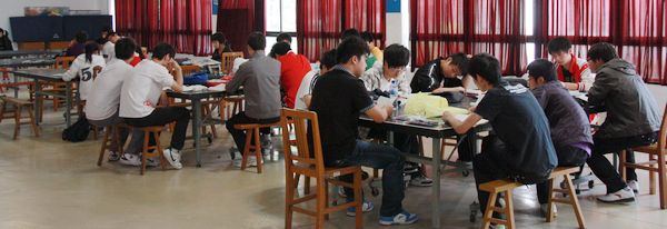 此时考生们正在考点内的休息室里全神贯注地做考前准备。