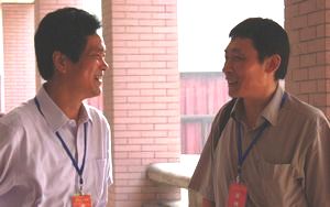 下午2:30进场铃声响起。考生们纷纷离开休息室,沉稳地走向考场(下图)。 考点主任通中校长姚天勇正与市招办驻考点的负责人边巡视考点边交流情况(右图)。 |