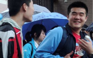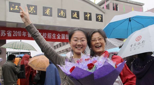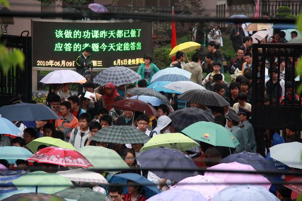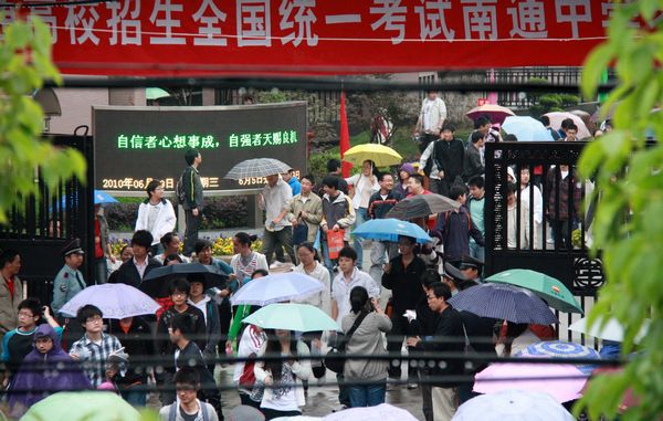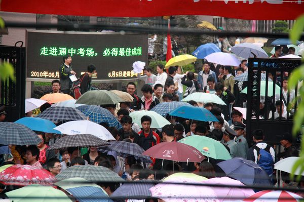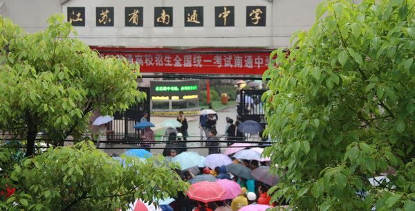 通中校园内外,这几天除了全力以赴直接为考生服务的送考老师、监考老师、后勤保障和保安人员、学生协勤志愿者外,还有一批网上在线的通中师生和校友满怀深情地关注者通中考生。在等待考生结束全部考试之前,让我们先看看网上通中人的一片深情。 早在高考第一天凌晨1点整,现上海交大在读的通中校友王闯同学就通过QQ群向通中考生发来祝福词“各位高考加油啦·~!!!~~~”。上午高考语文正在进行中,群里的往届校友和现通中高一高二的小师弟小师妹们就开始对江苏作文“绿色生活”展开了讨论。这里引用一段对话:高一男生蔡一能说“写环保文特别容易落俗套啊”,高二女生施琳说“是挺难的”,高一女生王莹说“估计要扯到哥本哈根”,现南大在读的通中校友张乐添说“其实哥本哈根大会蛮复杂的,牵涉到各国利益之争”..... 当天上午,通中教育博客网一位笔名“ntyzc”的老师连发66篇高考历史预测题供考生预习参考;紧接着,一位笔名“神的一滴”的老师又连续转载了7篇《2010年江苏高考作文老师下水作文示例》供考毕的考生分析参考。 第二天中午,参加江苏高考试卷扫描工作的江苏警官学院在读通中校友邢闽江连连发来短信,告诫参加高考的通中学弟学妹试卷字迹要端正清晰,否则扫描出来会模糊一片。她还强烈建议母校同学“要好好练字!” 今天下午,通中学生摄影记者们早早地就在QQ群里激烈讨论如何拍摄高考结束的镜头。4点刚过,他们就带着相机撑着雨伞前往学校了。下面这些高考结束时的欢快图片中就有高二男生杨圣、张奕林和高一男生蔡一能、女生陆维等同学冒雨拍的照片。 |