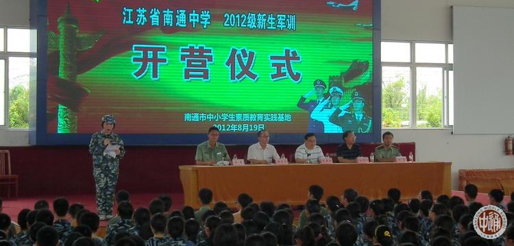 江苏省南通中学2012级新生军训自8月19日开始,计划至24日结束,历时6天,地点在位于如东县小洋口金蛤岛的南通市中小学生素质教育实践基地。