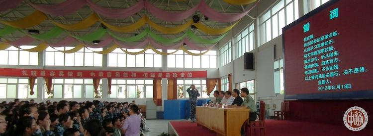 2012级新生军训开营仪式于下午2:30在营地礼堂召开。主席台上就坐的有我校校长助理沈惠祥(下图中)、我校学生处主任杨志冲(右二)、基地主任潘卫成(左二)、南通军分区军训教官大队长刘贤少校、主持人基地副主任冯军。