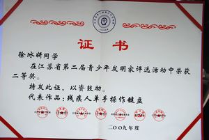由省知识产权局、省教育厅、省财政局、团省委、新华日报社、省发明协会七家单位联合举办的江苏省第二届青少年发明家评选活动颁奖大会于6月14日在南京召开。大会向10名获得一等奖和30名获得二等奖的青少年颁发了获奖证书和奖牌。我校徐冰妍同学(左图)获得二等奖,其代表作为“残疾人单手操作键盘”。 |