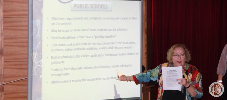 9月13日中午,我校国际文化系列讲座“如何进入国际名校”在宏观楼报告厅举办,一百多名学生和家长参加了此次活动。本次讲座的主讲人是曾获美国总统卓越奖的蜜希•桑切丝女士。桑切丝现为美国注册教育策划师、注册专业升学指导顾问、西北大学和莱斯大学的升学评审团顾问、《美国新闻和世界报告》大学评审团全美15位成员之一、美国大学升学顾问委员会(NACAC) 董事会员及南方大学升学顾问委员会(SACAC) 董事会员。