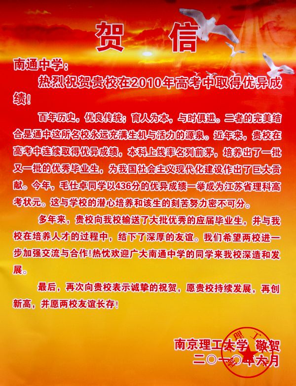 南京理工大学专程给我校送来贺信 来源:本站原创 发布时间:2011-04-11 14:44:53 浏览次数: 次 【字体:小 大】 6月27日下午,南京理工大学特派恢光平院长代表南理工校长专程向南通中学递交了贺信,我校姜学勤校长助理代表校长接受了贺信并向南京理工大学表示感谢。 以下为贺信全文。 分享到: 【打印正文】