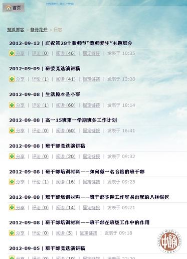 【编者按】开学后,很多新生家长非常关注班干部选举。一些家长说得很坦率:我的孩子是否当干部无关紧要,但选举过程要公平公正,不要老师操纵,否则孩子的心灵会受到消极影响。为此,本网站编辑部通过新生班的班级博客了解了选举过程,并向高一15班的班委会约稿谈谈选举。 孩子们的来稿《校园呼唤民主选举》特有标题党意味,把网站编辑都逗笑了。对通中来说,班干部的民主选举早就不必呼唤啦。 以下是该班的班级博客网址: http://blog.sohu.com/people/tz201215/233053396.html 右图是班级博客中近期的博文目录。 以下蓝色文字是来稿全文。作为选举过程,通中的孩子司空见惯;但作为一段记事,这篇来稿将为未来整理校史的老师留下真实资料。 |