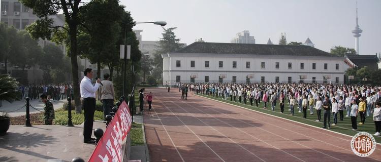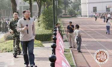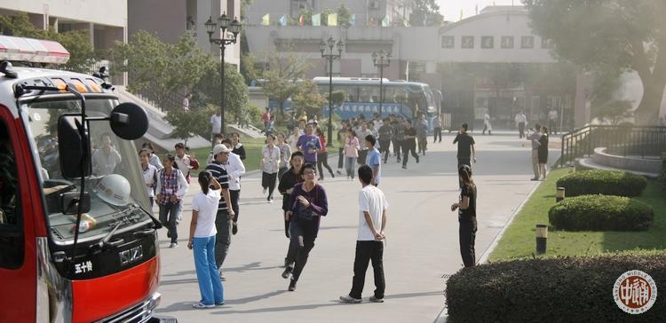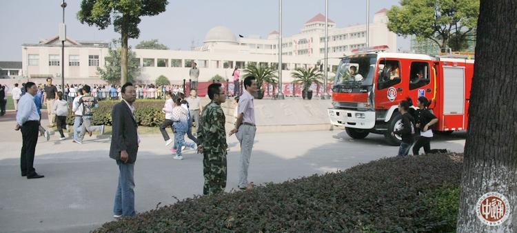 除上述领导组外,紧急疏散活动另设安全保障组、通讯组、伤员救护组和宣传摄像组,各教学楼每层每个楼梯口上下及校园各主干道均安排教室疏导岗位。 整个广播操时间为20分钟,共进行了两次演练。左图司令台上的是现场指挥杨志冲和消防支队干部,下图副总指挥刘忠保正在作总结。 |