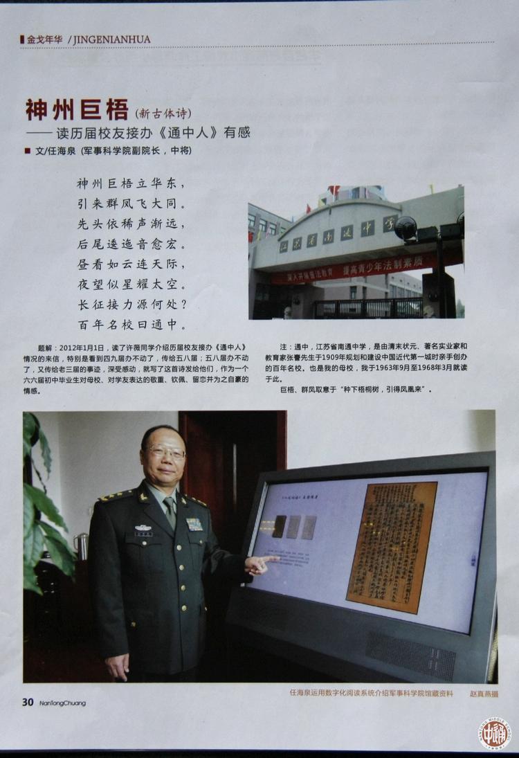 该诗刊发在《南通窗》期刊2012年第4期“金戈年华”栏目。在该诗题解中任海泉写道:2012年1月1日,读了许薇同学介绍历届校友接办《通中人》情况的来信,特别是看到四九届办不动了,传给五八届;五八届办不动了,又传给老三届的事迹,深受感动,就写了这首是发给他们,作为一个六六届初中毕业对母校、对学友表达的敬重、钦佩、留恋并为之自豪的情感。