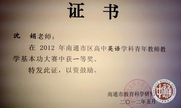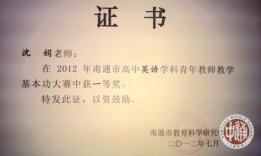 沈娟老师在市区和大市高中英语学科青年教师教学基本功大赛中均获得一等奖,证书如下。