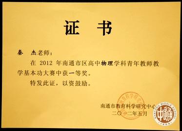 秦杰老师在市区高中物理学科青年教师教学基本功大赛中获得一等奖,证书如下。