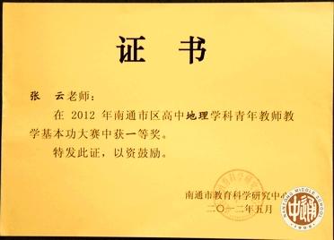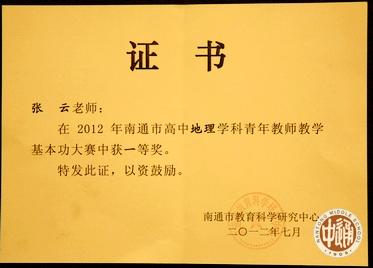 张云老师在市区和大市高中地理学科青年教师教学基本功大赛中均获得一等奖,证书如下。