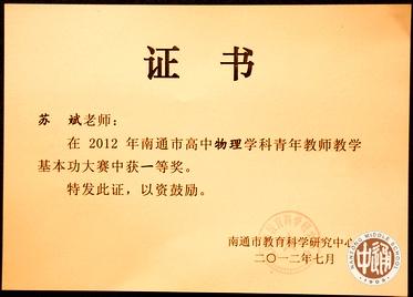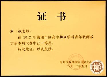 苏斌老师在市区和大市高中物理学科青年教师教学基本功大赛中均获得一等奖,证书如下。