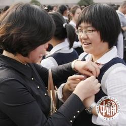 我校2011届优秀毕业生、第九届馥华奖学金获得者、南京大学数学系预备党员张欣翀同学带领全场高一新生面向国旗宣誓(上图):热爱祖国、追求真理;诚于做人、恒于学问;谦逊奋进,好学多思;守纪苦练,积健为雄;做一个有理想、有道德、有文化、有纪律的优秀的通中学生! 宣誓完毕,坐在后排的全体家长激动地涌进会场,向自己的孩子赠送书籍和寄语卡并亲手为孩子佩戴校徽(右图和下图)。 |