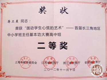 11月8-10日,由上海市教育委员会、江苏省教育厅、浙江省教育厅和安徽省教育厅联合举办的首届长三角地区中小学班主任基本功大赛在上海松江举行。比赛分为笔试和面试两部分,评委由教育部和四省(市)教育厅推荐的专家组成。 我校蒋卫星老师代表江苏省高中组参赛,荣获二等奖,其设计的主题班会方案被录入大赛成果汇编集结出版。 |