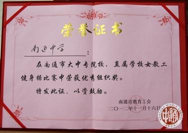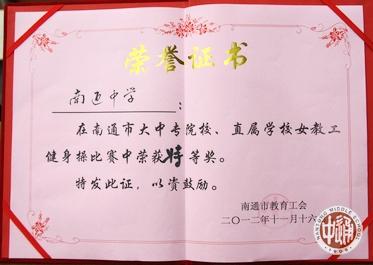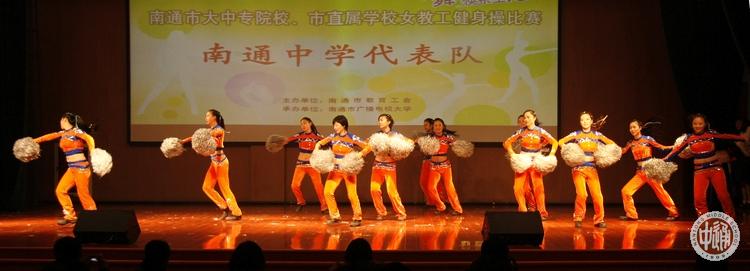 11月16日下午,南通市大中专院校、市直属学校女教工健身操比赛在电视大学15楼剧场举行,我校12位女教工组成的参赛队表现卓越,一举夺得特等奖和优秀组织奖。