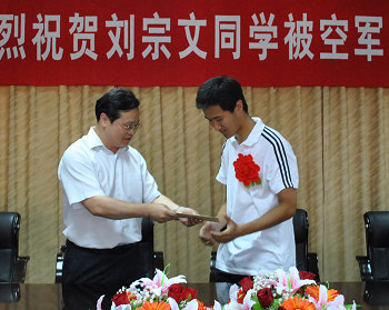 7月29日上午,我校举行高三年级部分师生座谈会,热烈祝贺我校高三2班刘宗文同学被空军航空大学航空飞行与指挥专业录取。座谈会由学生处主任助理蓝寿军主持,校长助理沈惠祥到会为刘宗文佩戴大红花,颁发2000元奖学金,并发表了热情洋溢的讲话。
