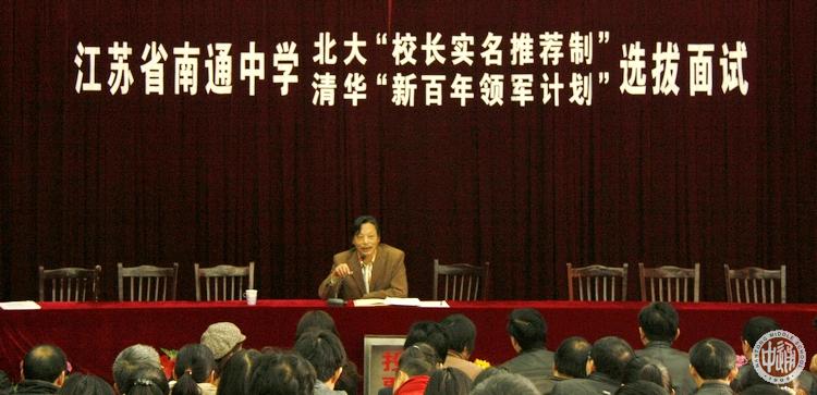 面试由副校长许建平主持,将在2013届高中毕业生中向北大清华两校各推荐1名综合素质突出的优秀学生。由考核委员会以1:5的比例确定的10名入围学生分别作了5分钟的竞选演讲,他们是(按演讲顺序排列):申请北大的学生高三2班孙培根、高三1班季灵晶、高三8班杨雨浓、高三6班陆洋和高三4班施艺,申请清华的学生高三5班方佳璋、高三7班刘越、高三5班刘路、高三14班季乐琪和高三6班滕彤。