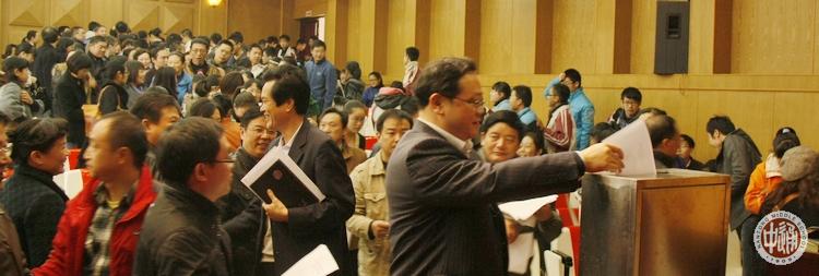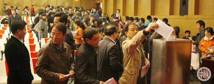 考核委员会成员人手一册全面介绍竞选学生的资料。在阅读资料并认真听取竞选演讲后,全体考核委员会成员通过无记名投票对竞选者做出评价。以下两图是考核委员会成员现场投票镜头。