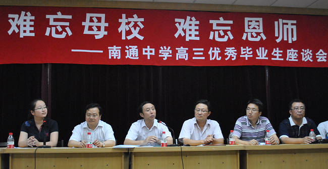 2010年7月29日下午3:00我校在科学楼一楼会议室举办“难忘母校,难忘师恩——高三优秀毕业生座谈会”。校党委书记韩明飞、校长助理沈惠祥、姜学勤、学生处蓝寿军、党政办陈风雷到会,团委书记江谨主持会议。高三优秀毕业生代表,部分高三年级班主任,高二年级五十多位优秀学生代表参加了座谈会。
