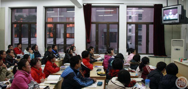 优秀同学介绍了自己感觉非常有效的学习习惯和技巧,交流了期中考试和小测验过程积累的经验,还对学习过程中的困惑做了探索性的思考。到会的各班同学还纷纷提问,对感兴趣的问题进行了咨询。下图是教室收看转播的镜头。