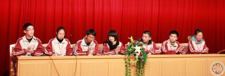 主席台上入座的是高一年级本学期来学习始终保持优异成绩的同学,左端为主持人高一11班刘路,右边依次是高一8班徐亦凡和沈铮阳、高一11班奚紫薇、高一8班方佳璋、高一1班钱天笑和董雨萌。百余名高一学生代表现场出席交流会,其他高一年级学生在教室收看实况转播。