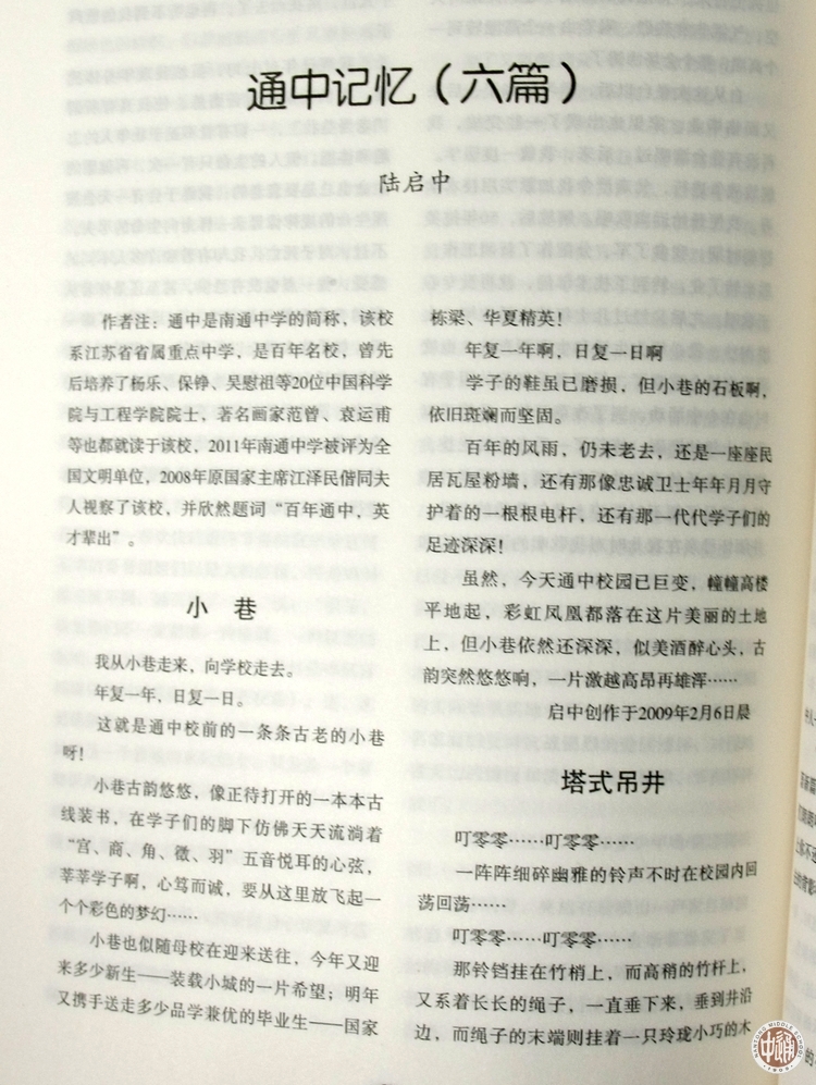 由中国散文学会编选、中国文联出版社2012年11月第一版第一次印刷的《中国散文大系-第1辑》刊发了我校1963届校友、现年69岁的陆启东先生(下左图)的散文《通中记忆(六篇)》。六篇小标题分别为小巷、塔式吊井、荷花池、木楼、严师、班会,记叙了上世纪六十年代初通中学生对学校的美好印象。