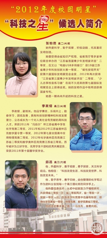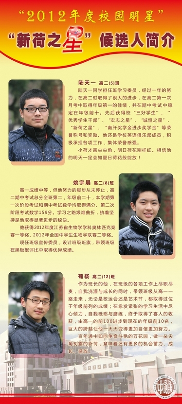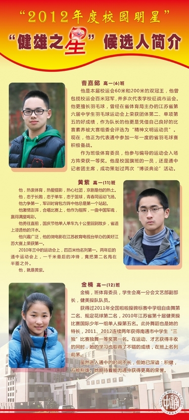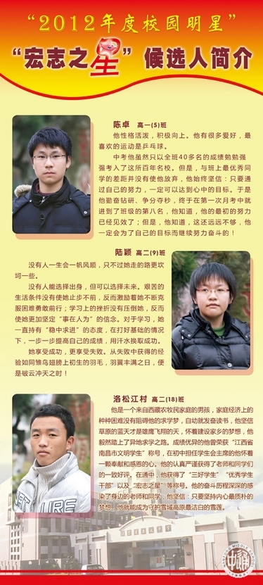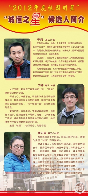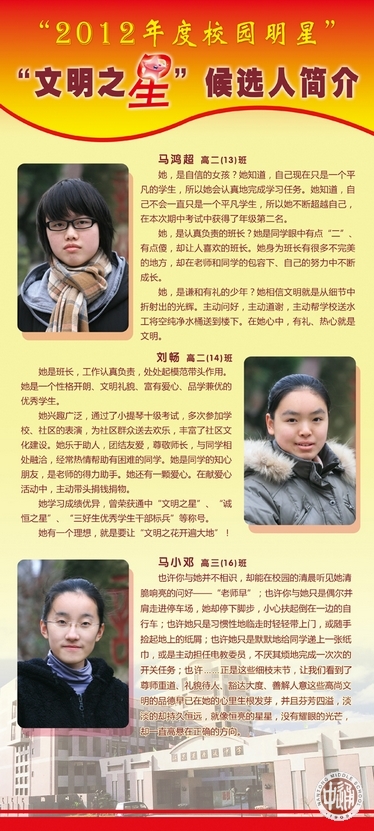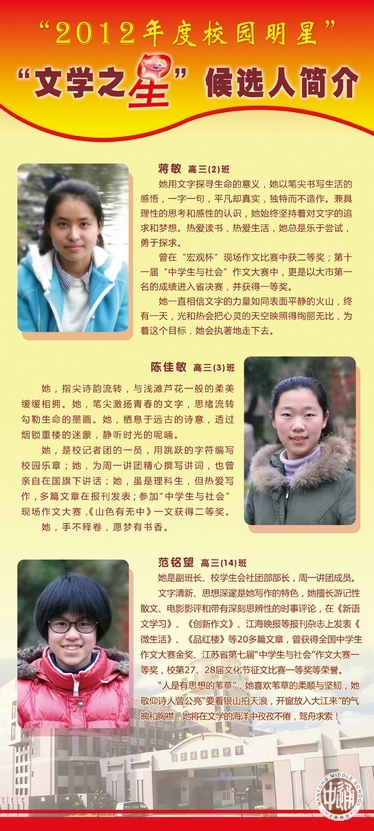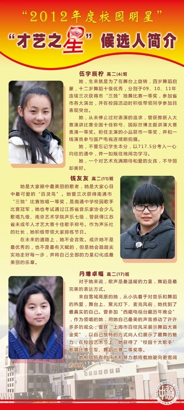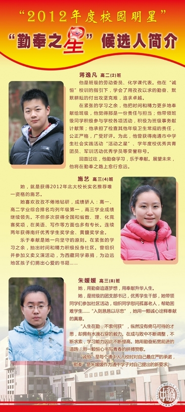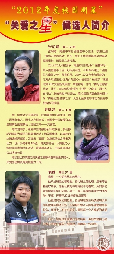 从上周开始,一年一度的“校园明星”评选活动在通中校园热烈展开。走进校园,一眼就能看到诚恒大道旁由各班师生按3:1比例推荐的30名明星候选人展板。今天(12月26日)下午,全校学生将投票确定明星人选。