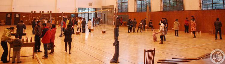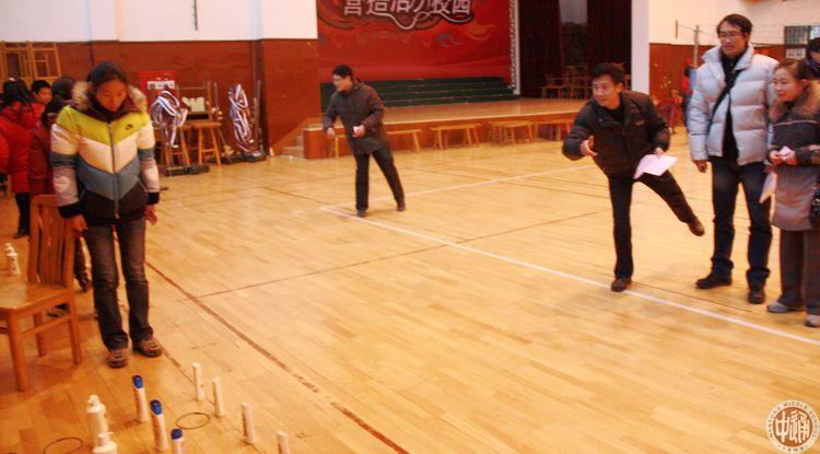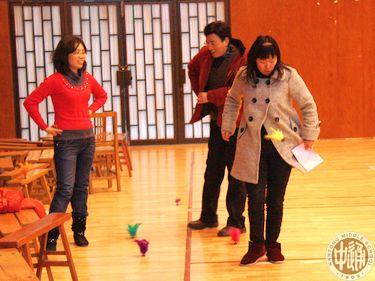 下左图游戏《谁是毽子王》,游戏者连续踢毽子满30个不落得三等奖,40个不落得二等奖,50个不落得一等奖,连续不落最多者将授予毽子王称号。下右图后勤处的师傅们正忙着给获奖会员颁发奖品。