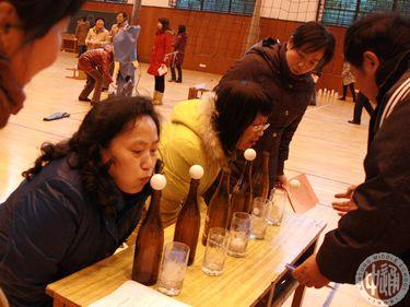 下左图游戏《吹球入杯》,在啤酒瓶上放一只乒乓球,将球吹入前面的玻璃杯中,入杯后反弹出杯子则视为失败,在一分钟内依次吹并排放在五只汽水瓶上的乒乓球,吹入四球获一等奖,吹入三球获二等奖,吹入二球获三等奖。
