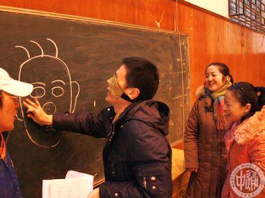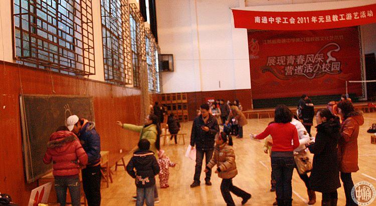 12月30日下午,南通中学一年一度的欢庆元旦教工游艺活动又生龙活虎地展开了。 右图游戏《妙“鼻”生花》,游戏者在距离画像4米蒙好眼睛后,原地顺时针旋转三圈后,上前为脸谱补贴鼻子,位置对应准确即为获胜。