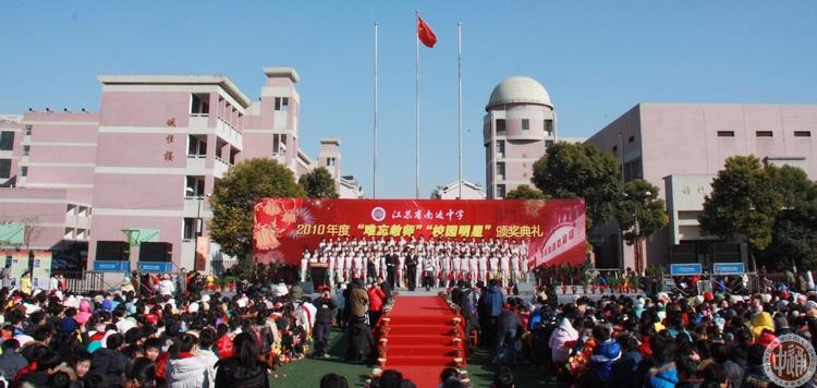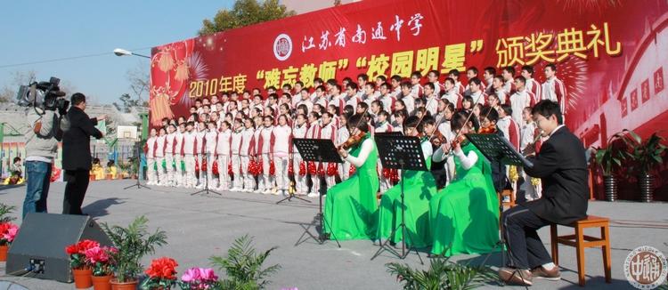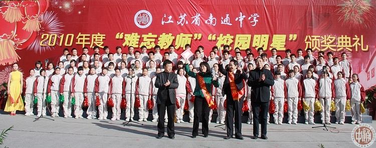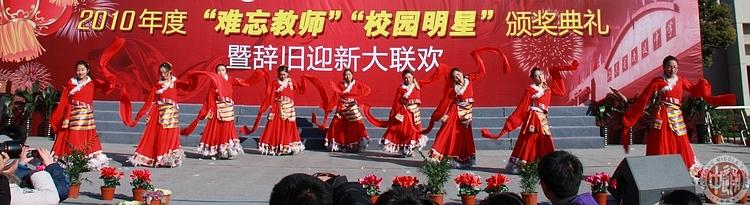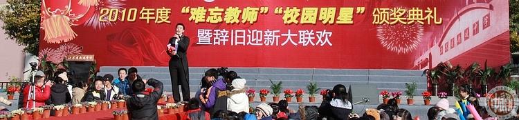 12月31日下午,我校2010年度“难忘教师”和“校园明星”颁奖典礼暨辞旧迎新大联欢在校园操场隆重举行,市教育局相关领导和全校3000余名师生出席,周蜜、凌子、俞成、刘路等4名同学主持。