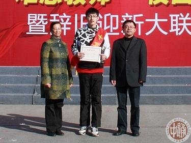 为周建民老师和符小斌老师颁奖的是市教育局党组成员副局长王笑君(左一)和我校党委书记韩明飞(右一)。