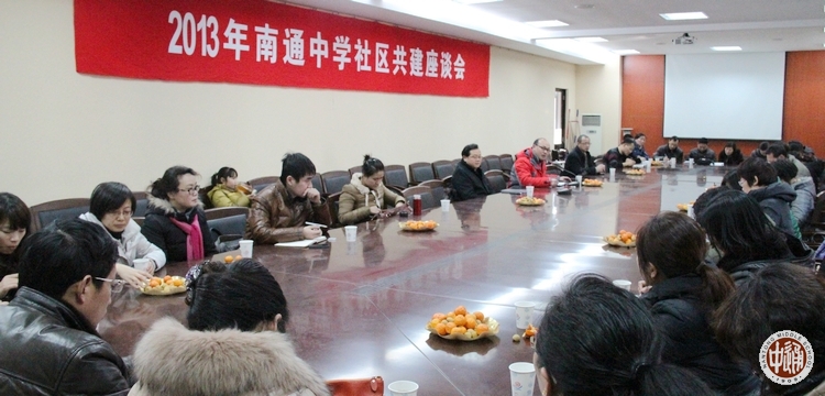 1月27日下午,校长室召开2013年新春社区共建座谈会,来自和平桥街道、城东街道、新城桥街道、钟秀街道、学田街道及下辖与我校有结对关系的36个社区的干部应邀参加。座谈会由学生处主任助理潘雪峰主持,副校长沈惠祥向大家汇报了一年来我校学生参加社区活动取得的进步和收获,并代表学校向各街道和社区表示衷心感谢。