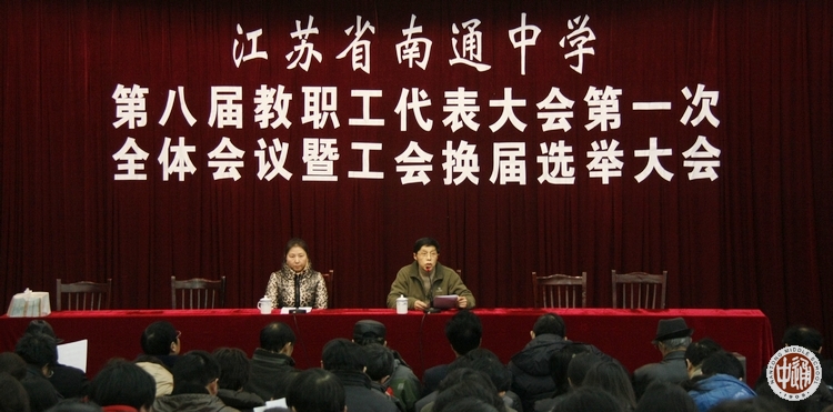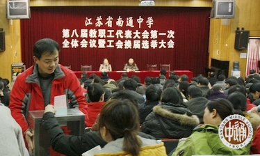 1月28日下午2:00,我校第八届教职工代表大会第一次全体会议暨工会换届选举大会在敬铭楼报告厅隆重举行,全体教工和我校退休老领导出席。大会由执行主席卞秀凤主持,会议议程包括:1、第七届工会委员会主席陆刘华报告工会工作;2、全体教工参加工会换届选举投票;3、八届一次教代会开幕式;4、校长姚天勇作学校年度工作报告;5、宣布工会换届选举选举结果。