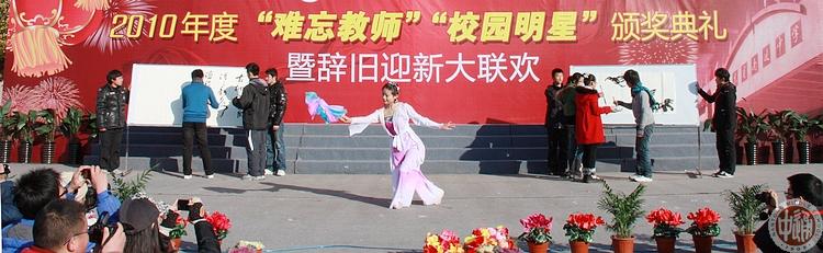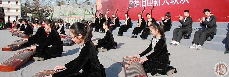 上图同学们为获得“难忘教师”称号的老师打出喝彩标语,下图马小邓等同学表演民乐合奏《一帘幽梦》。
