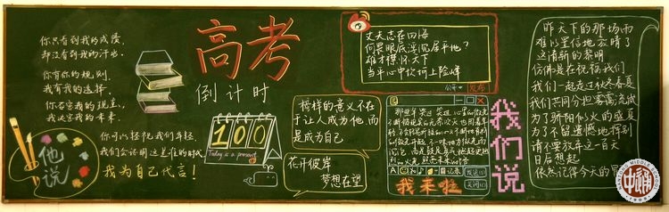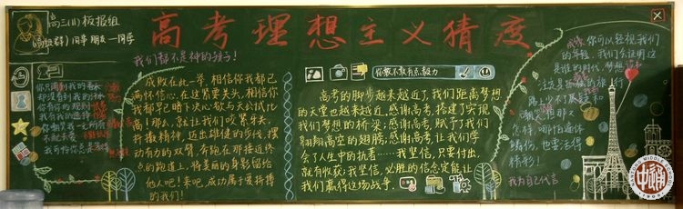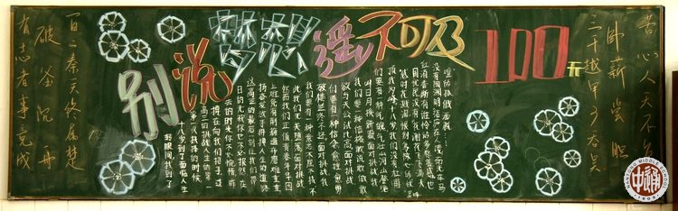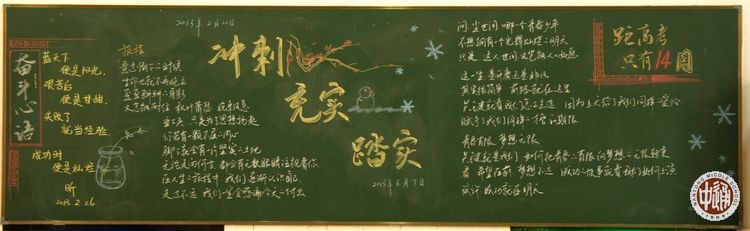 在高三学生眼里,日子如飞梭穿行,转眼2月已过,今天是3月1日,离高考还剩不足100天。前天中午,应学生处推荐,网编提着相机兴冲冲地把高三年级教室巡访了一遍,拍下了所有18个班的黑板报。高考前的紧张气氛从班级黑板报中可见一斑,其中1-17班是普通班,第18班是国际课程班。以下图片排列按班级顺序从高三1班开始。