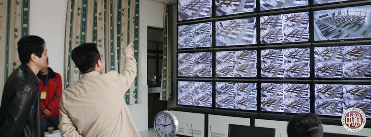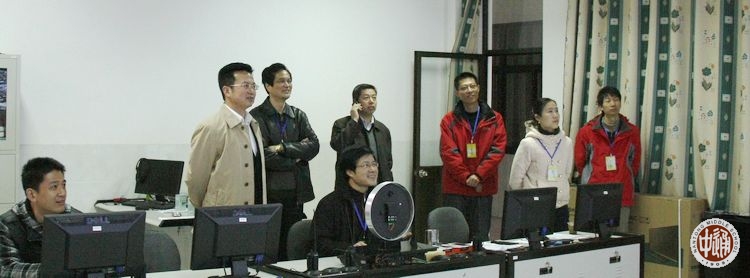 以下两图郭毅浩与考点主任姚天勇在考点监控中心正通过监控视频视察各考场情况。