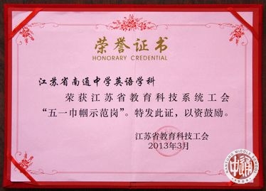 “三八”妇女节前夕,江苏省教育科技工会为表彰教科系统女教职工立足本职,爱岗敬业,勇于奉献的精神,促进社会主义和谐社会建设中充分展现女教职工的时代风采,特授予我校英语学科教研室女教师团队“江苏省教育科技系统五一巾帼标兵岗”称号。南通市教育系统共有六个团队获此殊荣。有关表彰决定详见“苏教科工(2013)12号”文件《关于表彰江苏省教育科技系统“五一巾帼标兵岗”、“五一巾帼标兵”的决定》。