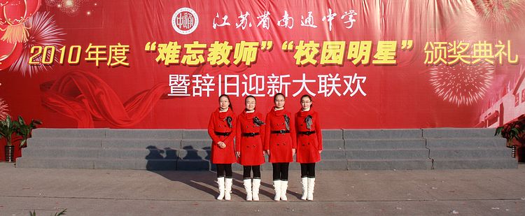 这是2010年最后一天,当我校难忘教师和校园明星颁奖典礼落幕的那一刻,四位礼仪生圆满完成了颁奖受奖引领和奖状奖杯呈递任务,静静地站上颁奖台拍下了这张光彩照人的留念照。她们是(下图左起):高一1班董雨萌、高一12班李响、高一6班吴嘉蕙、高一15班章小雨。