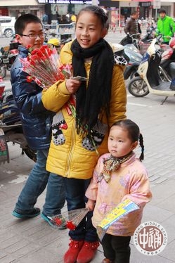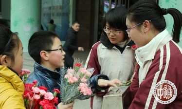 烂漫的笑脸伴随着小学生响亮的嗓音,吸引了无数路人的目光。他们在人群中飞快地穿梭,幼小却有力的双手紧紧握着一大束康乃馨,急急地劝导行人买上一束花,献出爱心。