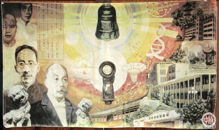 本网站上周关于高三年级成人仪式报道中有两幅图是家长给孩子系成人纪念纱巾的镜头。下图就是纱巾图案,也就是我校科学楼底厅正面巨幅丝质挂毯的图案。图中人物有百年前我校的创始人张謇(前一)、范当世(三)、首任校长孙宝书(四),以及曾为我校题词“积健为雄”的北大校长蔡元培(二)。