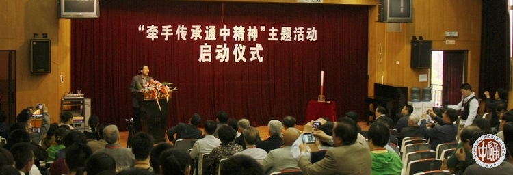 5月6日下午第三课时间,我校“牵手传承通中精神”主题活动启动仪式在科学楼报告厅隆重举行。该活动是由我校关心下一代工作委员会(简称关工委)牵头、学生处主持、校团委协助展开的大型持续性教育实践项目。活动中,在校的高一和高二年级学生将以班级为单位与各届校友建立“牵手传承”结对关系,常年开展访问老校友的互动活动,并通过班级日志博客等方式记写发布通中人的故事,包括当年在校和后来人生发展过程中的故事;活动的主旨在于通过与历届校友的持续交流沟通,全面挖掘百年通中深厚的历史资源,努力传承“诚恒”校训表达的通中精神,充实近年我校“难忘教育”实践的内涵,提升“精品高中”办学理念。