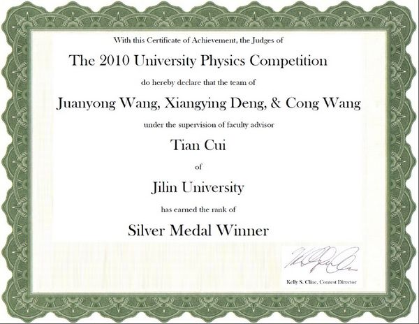 我校2009届毕业生、现吉林大学物理学院大二学生王隽永在2010年国际大学生物理竞赛(The University Physics Competition)中与另一同学合作,在来自哈佛等知名大学的58支队伍比拼中一举获得大赛银奖,成为中国内地唯一获奖的大学代表。右图是王隽永在吉林大学校门前的留影,下图是本次大赛的获奖证书。 |