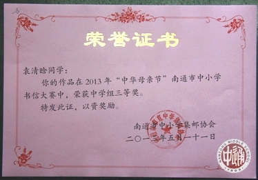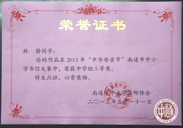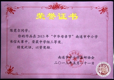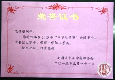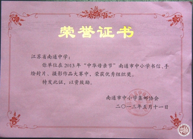 由南通市中小学集邮协会主办的“中华母亲节”南通市中小学书信、手绘封片、摄影作品大赛于5月11日确定各校参赛成绩并颁奖。 大赛设中学组书信一等奖2名,我校陆佳维同学获一等奖;设中学组书信二等奖3名,我校季乐琪同学获二等奖;设中小学摄影作品优秀奖11名(注:摄影作品不设等级奖项),我校路凌志、游雨频同学获优秀奖;设中学组书信三等奖14名,我校袁清晗、陈莞尔、林静、范铭望同学获三等奖;我校同时荣获优秀组织奖。 大赛另设优秀组织奖6名,我校荣获优秀组织奖。 |
