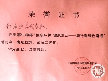 为丰富青年教师业余生活,倡导绿色、健康、低碳、环保出行的理念,为建设资源节约型、环境友好型社会贡献力量,市教育局团委于6月1日上午举办局直学校青年教师安惠生物杯“低碳环保健康生活——骑行看绿色南通”比赛活动。 本次活动共有11个局直单位代表队参加,每队3名选手。我校代表队由地理学科翟云霞(下图中)、物理学科朱华(左)和孟小兵(右)组成。比赛设团体一等奖1名、二等奖2名、三等奖3名。我校队员奋力拼搏力战群雄,以第二名的优异成绩一举夺得二等奖。 |