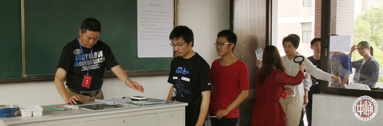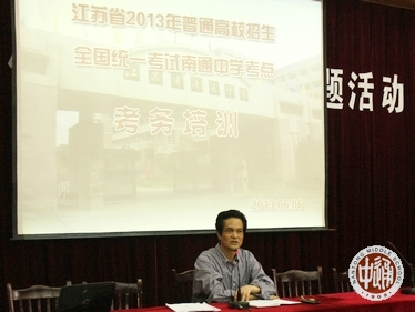 2013年普通高校招生全国统一考试将于6月7-9日三天内进行。 6月6日,我校考点准备工作就绪。当天上午,我校和天星湖中学的116名监考员集中敬铭楼三楼报告厅,由我校校长、考点主任姚天勇作考务培训(左图和下图)。培训内容包括监考员职责、考试工作规范化用语、考试实施程序、考场偶发事件处理办法、违规行为处理办法、金属探测器使用规范、考生守则等。与此同时,各考场粘贴考场号、座位号、考生须知布告等,并对考场内时钟、音响设备和电子设备作最后检测。 |