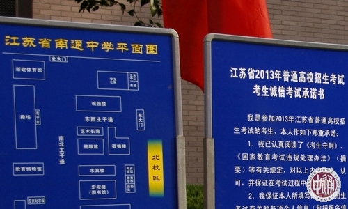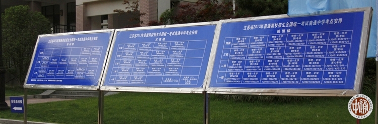 以下两图是考点内主干道两侧安置的考点平面图、考场分布图和张榜公布的考试时间科目表、考生守则、国家教育考试违规处理办法(摘要)、普通高考计算机网上评卷考生作答须知、江苏省2013年普通高校招生考试考生诚信考试承诺书和考生休息室安排表。右下图是为考生和送考老师准备的考点食堂餐券订购处。
