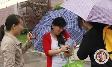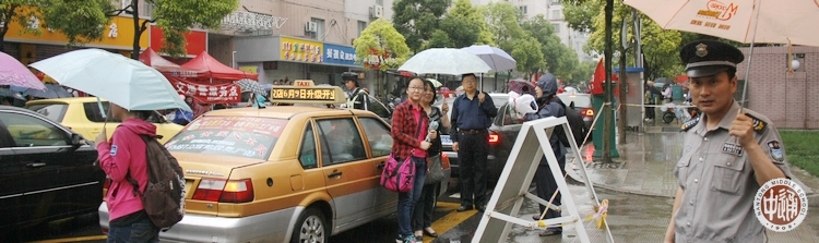 从昨夜开始一直下雨,空气洗刷得格外清新。考点门口班主任忙着给考生发准考证,考生家长帮忙打着伞呢。