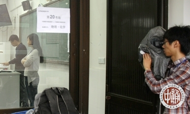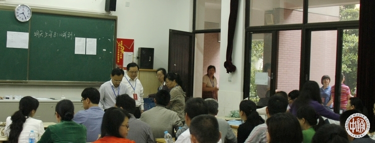 下图考点副主任沈惠祥正在主考室检查监考员准备工作,正面墙上时钟显示8:25。
