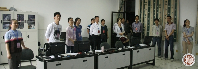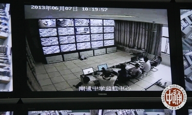 下图考点主任姚天勇、副主任韩明飞与市教育局局长郭毅浩和监察局副局长施学雷一行在考点监控中心检查各考场情况。